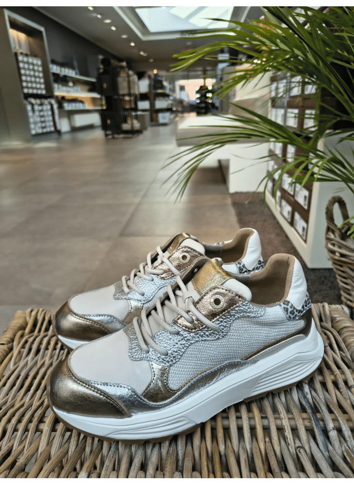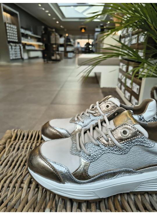 Deze nieuwe sneaker uit de collectie Next Generation heeft een vrouwelijke en speelse uitstraling. Het afgeronde silhouet in combinatie met gebogen appliqués roept associaties op met de Rainbow Bridge bij de Niagara Falls. Hoogwaardige materialen, waaronder glad, metallic en suèdeleer, worden op een kleurrijke manier gecombineerd. Stretchleer en zachte kussentjes zorgen voor optimaal comfort.